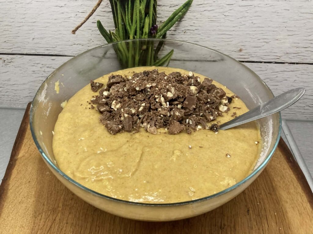 W osobnej misce połącz mąkę, proszek do pieczenia, sodę, cynamon oraz opcjonalne przyprawy (imbir, kardamon, gałkę muszkatołową). Suche składniki wsyp do mokrych i wymieszaj tylko do połączenia składników. Na koniec dodaj posiekaną czekoladę i delikatnie wymieszaj.