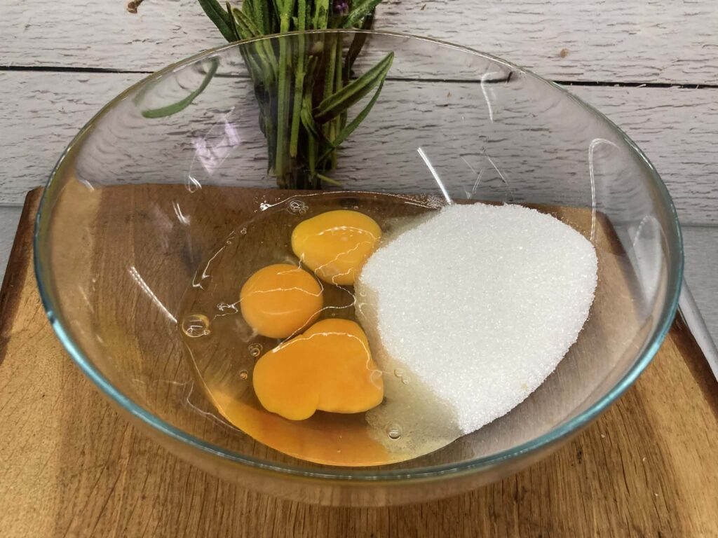 Do dużej miski wbij 3 jajka, wsyp cukier i cukier waniliowy. Mieszaj rózgą lub mikserem przez około minutę, aż masa lekko się spieni.