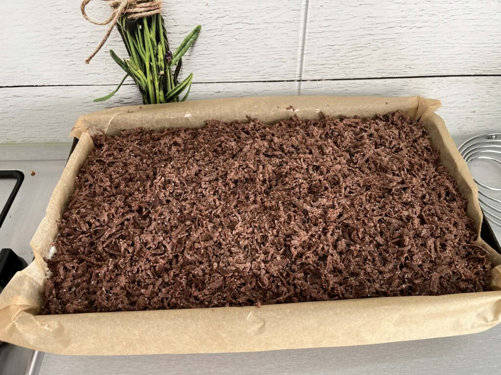 Na wierzch zetrzyj kakaowe zamrożone ciasto, również na tarce o grubych oczkach.
