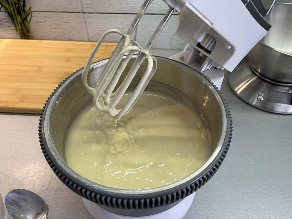 Mąkę wymieszaj z proszkiem do pieczenia i wsyp do masy. Wymieszaj do połączenia składników.