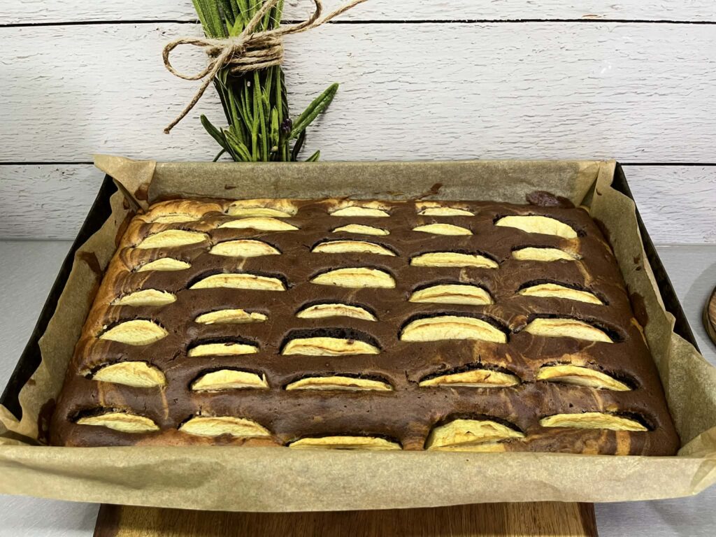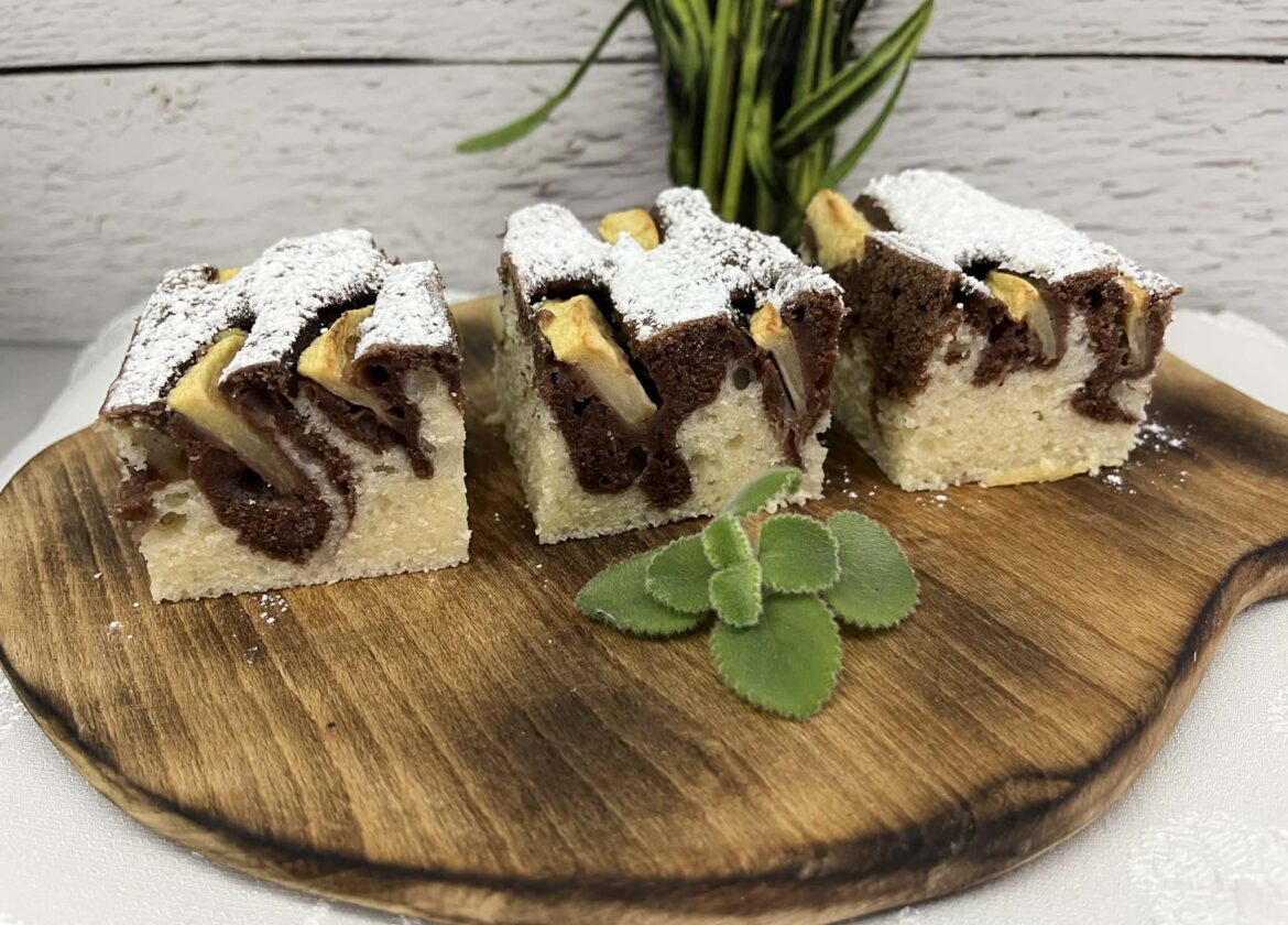 To proste i szybkie ciasto ucierane na oleju, które zawsze się udaje. Jest wilgotne, puszyste i delikatnie waniliowe, a dodatek kakao tworzy ładny dwukolorowy efekt. Soczyste jabłka sprawiają, że ciasto jest aromatyczne i idealne do kawy lub herbaty.