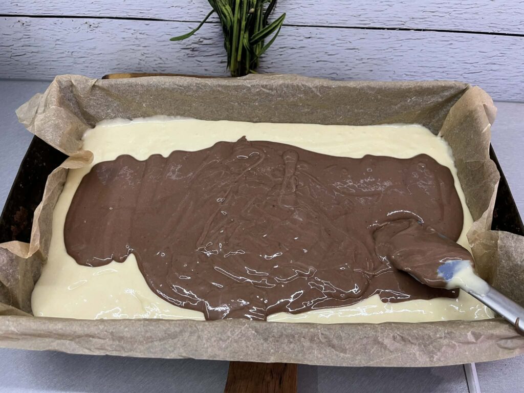 - Aby uzyskać ładny marmurkowy efekt, możesz delikatnie przemieszać jasne i kakaowe ciasto patyczkiem.