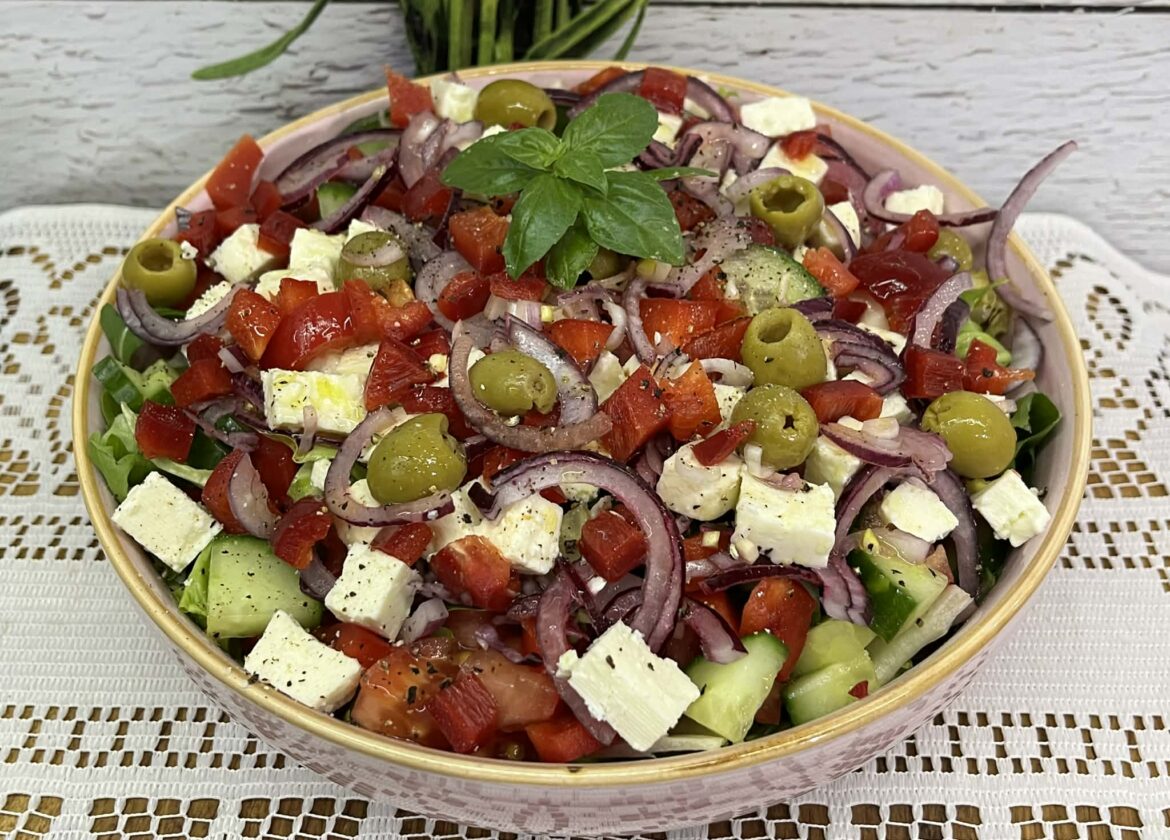 To prosta, świeża i lekka sałatka idealna na lunch, kolację lub jako dodatek do obiadu. Połączenie chrupiących warzyw, słonych oliwek i kremowego sera typu bałkańskiego daje bardzo przyjemny, śródziemnomorski smak. Całość dopełnia szybki dressing cytrynowo-oliwny, który podkreśla naturalny smak warzyw.