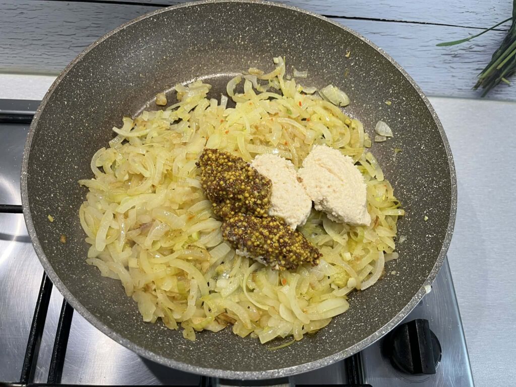Do cebuli dodać chrzan, musztardę i śmietanę. Doprawić solą i pieprzem. Wszystko dokładnie wymieszać i chwilę podgrzać.