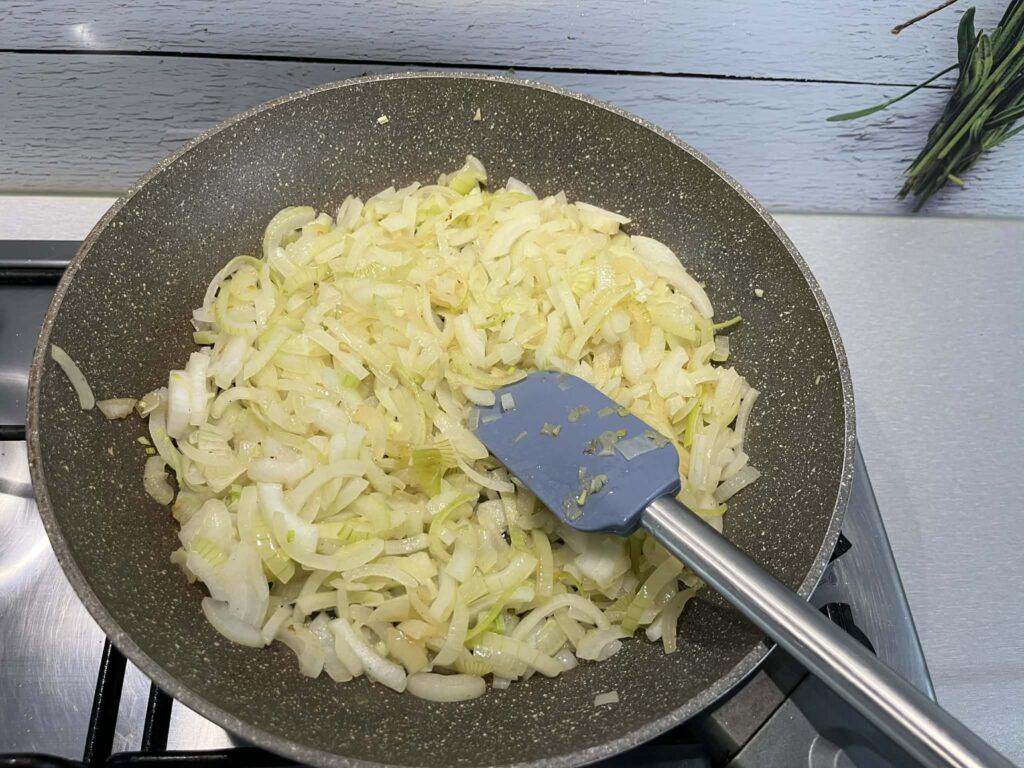 Na tej samej patelni zeszklić pokrojoną cebulę, aż będzie rumiana. Pod koniec dodać posiekany czosnek.