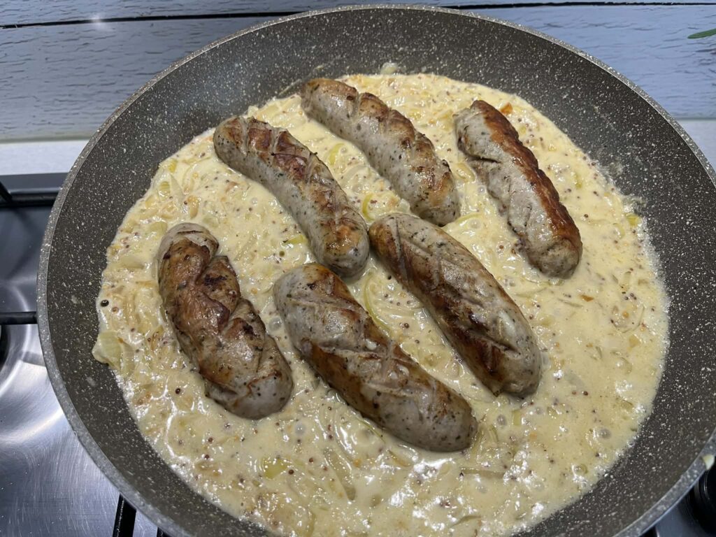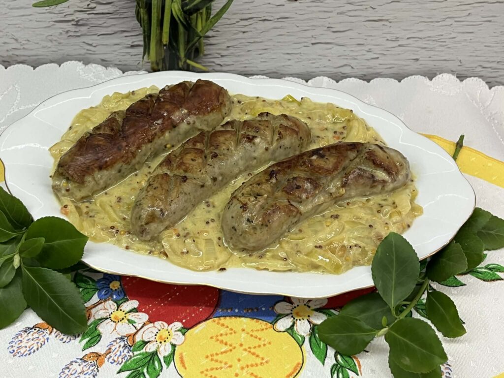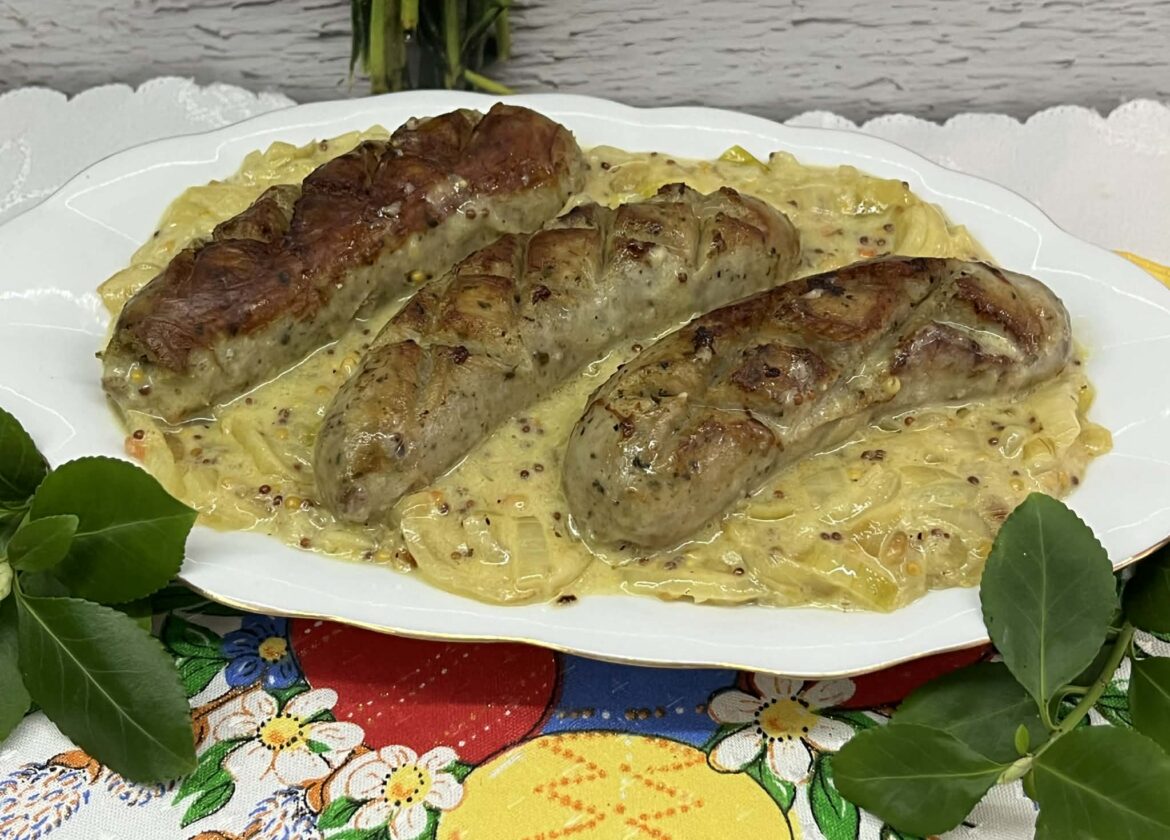 To klasyczne, domowe danie o wyrazistym smaku, idealne na obiad lub świąteczny stół. Delikatna biała kiełbasa łączy się tutaj z kremowym, lekko ostrym sosem na bazie śmietany, musztardy i chrzanu. Całość jest aromatyczna dzięki przyprawom i podsmażonej cebuli, która dodaje słodyczy i głębi.