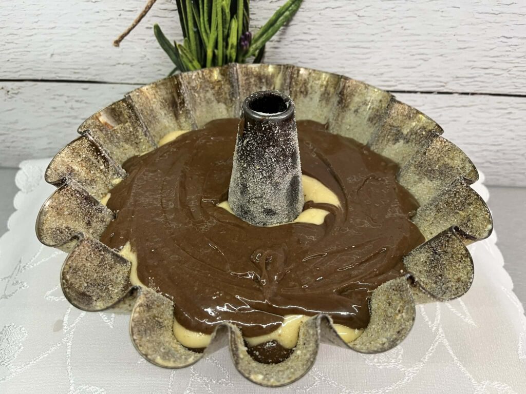 Do formy wlewaj na przemian jasne i ciemne ciasto. Możesz lekko przemieszać patyczkiem, by uzyskać efekt marmurka.