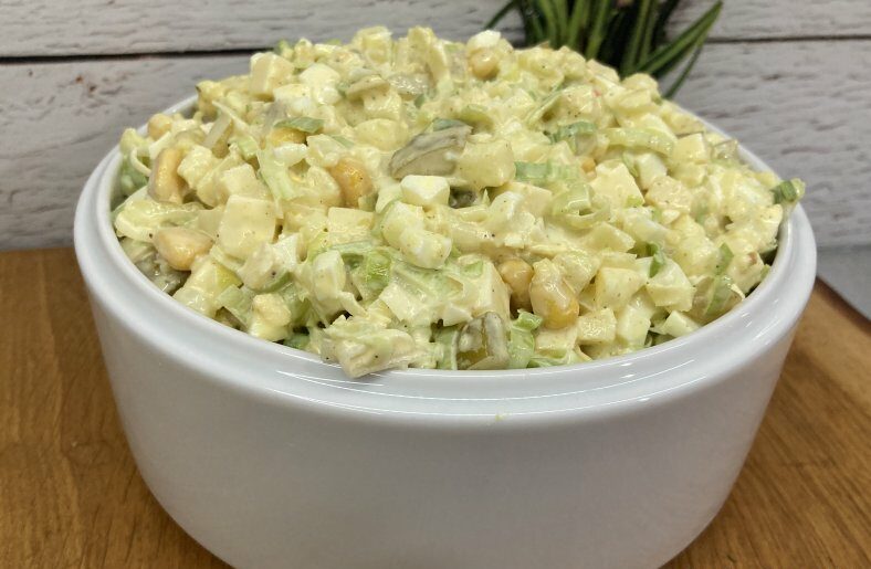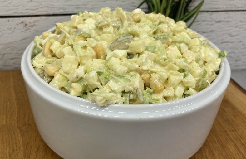 To klasyczna, domowa sałatka o wyrazistym smaku – delikatnie słodka dzięki kukurydzy i jabłku, lekko ostra przez pora i cebulę, a przy tym kremowa dzięki sosowi majonezowo-jogurtowemu. Idealna na święta, imprezy lub jako dodatek do kolacji.