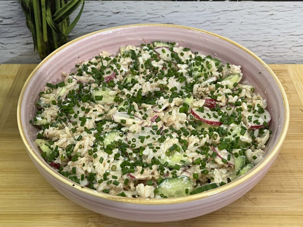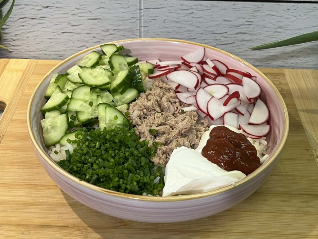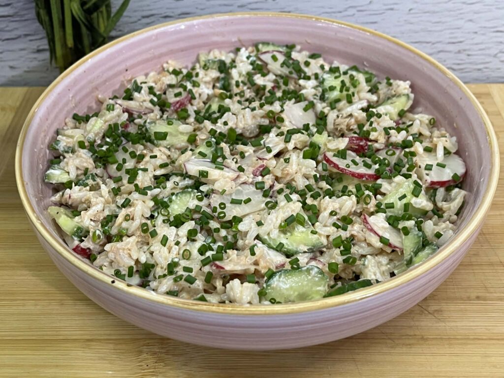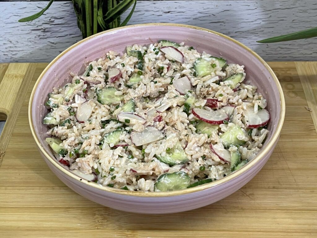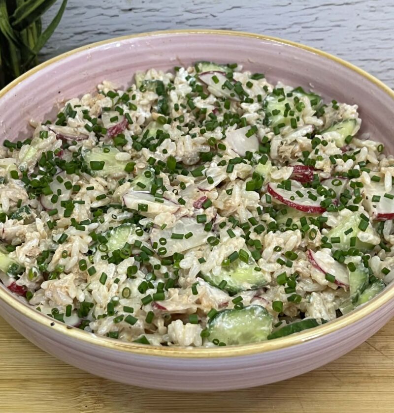 To prosta, szybka i sycąca sałatka, idealna na lunch, kolację albo jako dodatek na spotkania ze znajomymi. Połączenie delikatnego ryżu, tuńczyka i chrupiących warzyw daje świeży smak, a kremowy sos łączy wszystko w całość.