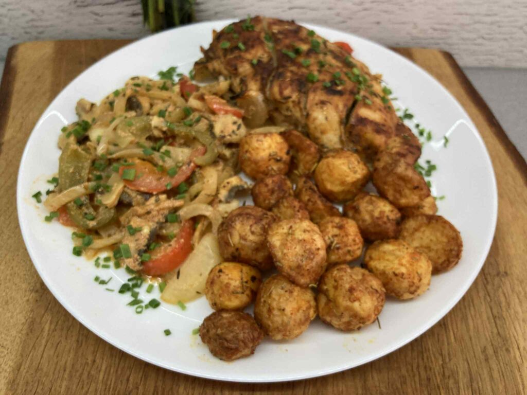 - 4–5 podsmażonych pieczarek (pokrojonych)