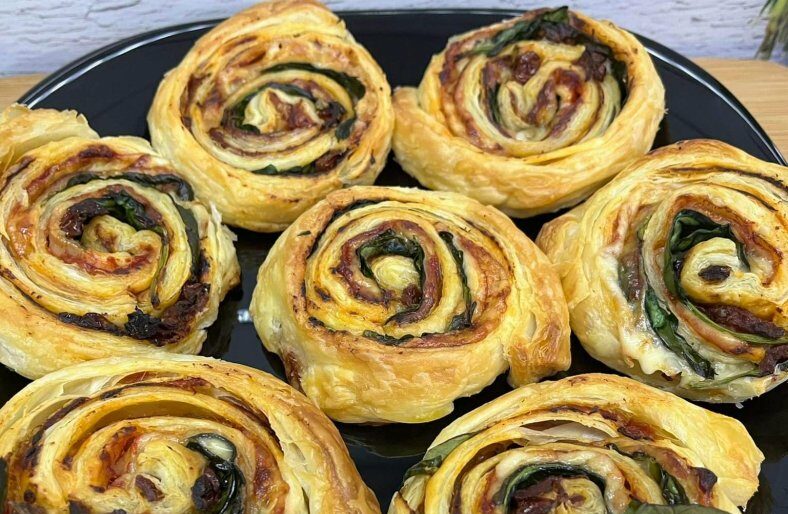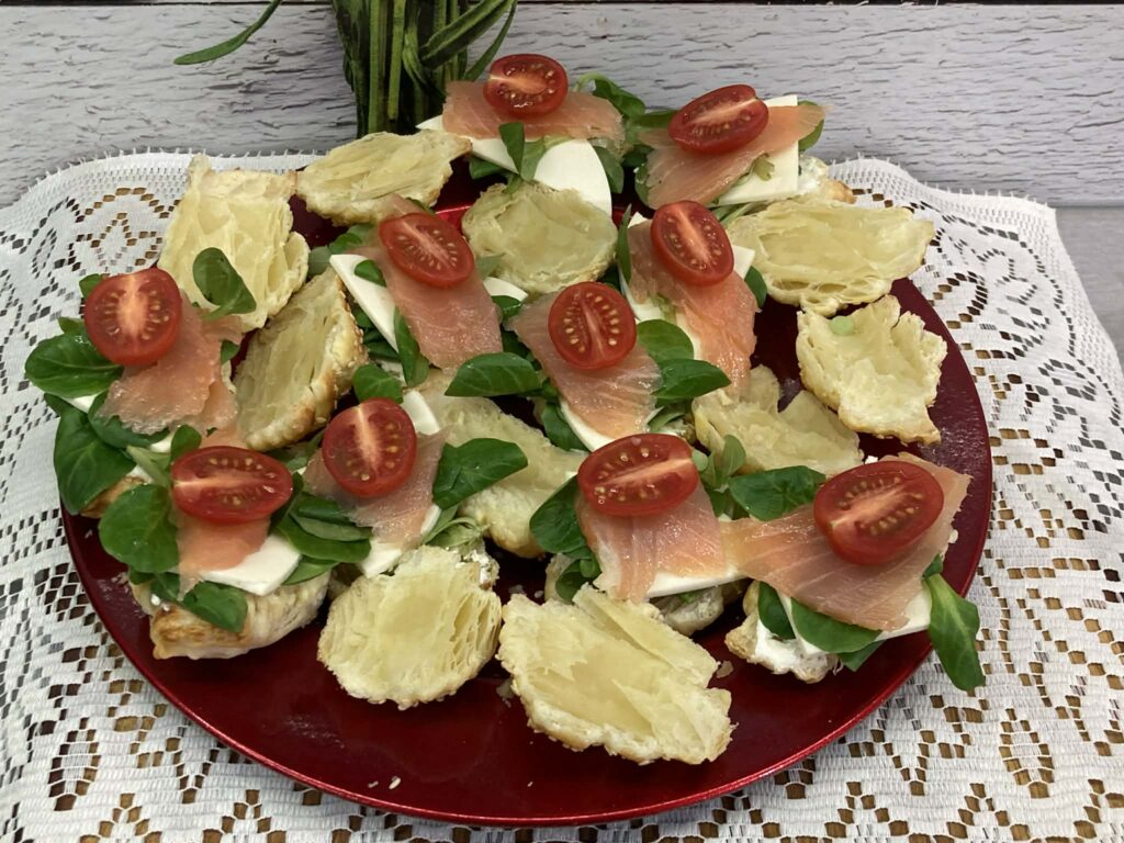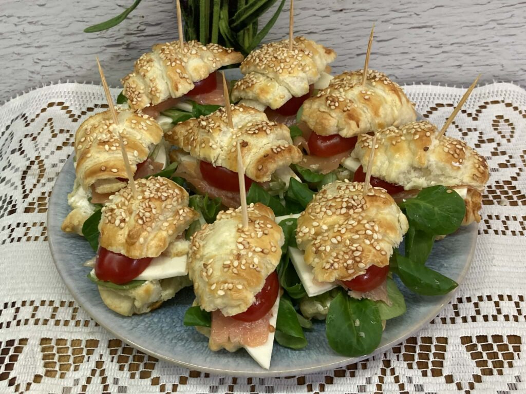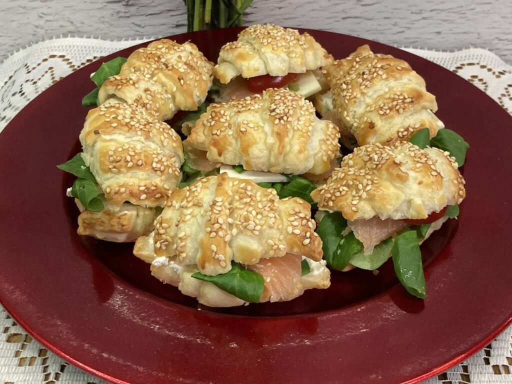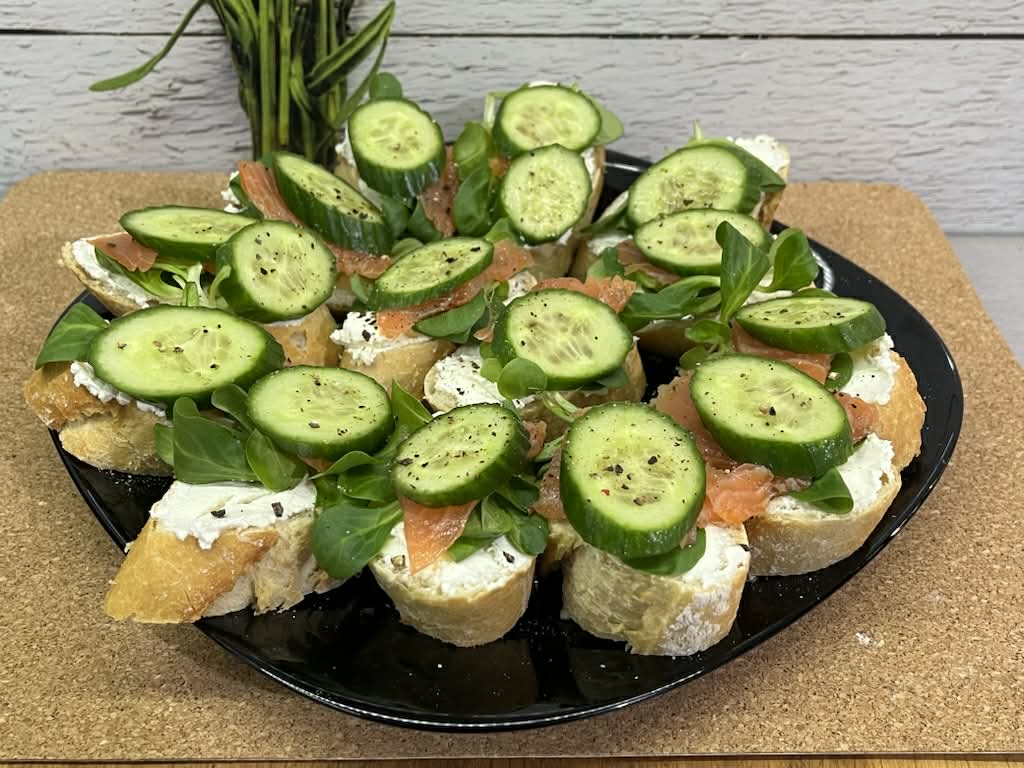 Mini kanapeczki z ciasta francuskiego to efektowna i smaczna przekąska idealna na przyjęcia, święta lub bufet. Chrupiące, złociste ciasto stanowi doskonałą bazę dla kremowego serka śmietankowego, delikatnego wędzonego łososia oraz świeżych listków szpinaku. Dodatek ogórka i koperku nadaje lekkości, a czarnuszka podkreśla smak i dekoracyjny charakter kanapeczek.
