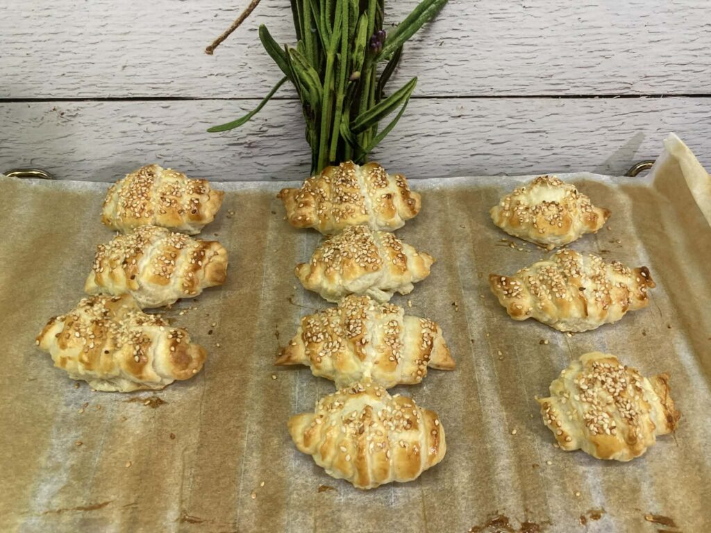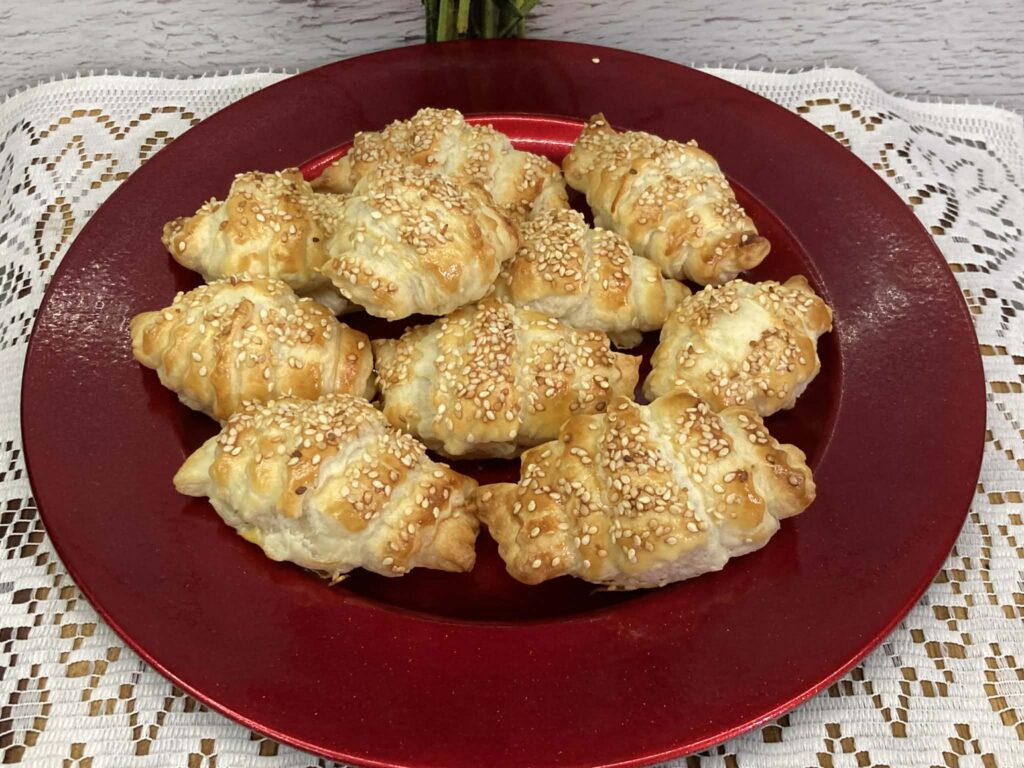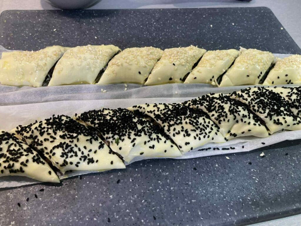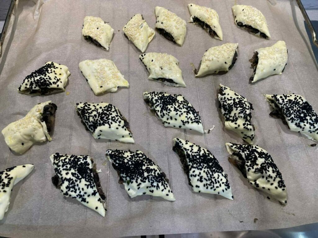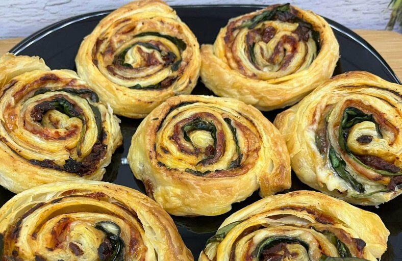 Mini kanapeczki z ciasta francuskiego to efektowna i smaczna przekąska idealna na przyjęcia, święta lub bufet. Chrupiące, złociste ciasto stanowi doskonałą bazę dla kremowego serka śmietankowego, delikatnego wędzonego łososia oraz świeżych listków szpinaku. Dodatek ogórka i koperku nadaje lekkości, a czarnuszka podkreśla smak i dekoracyjny charakter kanapeczek.