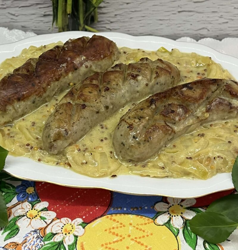 Biała kiełbasa w sosie chrzanowo musztardowym